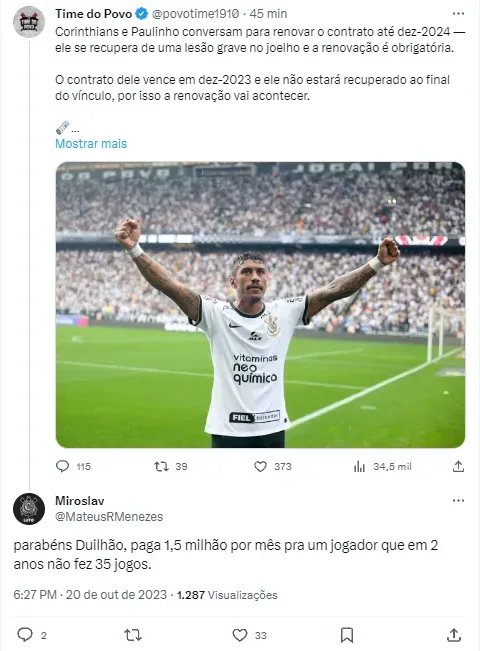 Isso porque segundo jornalista Samir Carvalho, a continuidade do meio-campista de 35 anos é certa por causa de uma regra da FIFA. A Federação obriga que o Clube estenda o vínculo com um atleta em final de contrato quando ele estiver lesionado ou incapacidade por motivos de saúde. Com o atual contrato indo até dezembro deste ano, Paulinho deve ficar no Timão até dezembro de 2024.