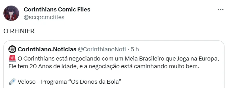 Com as características apresentadas por Veloso, corinthianos cogitaram que Reinier seria uma possibilidade, tendo em vista seu insucesso no Velho Continente desde que foi negociado com o Real Madrid, em 2020.