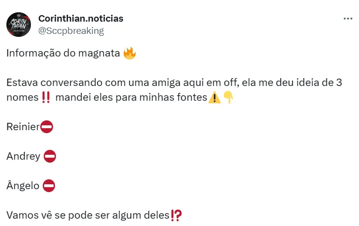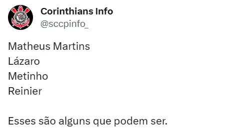 Por falar em jogador do Flamengo, há rumores de que o Corinthians estaria interessado na contratação de Reinier, revelado pelo clube carioca e que atualmente defende a camisa do Frosinone, da Itália.