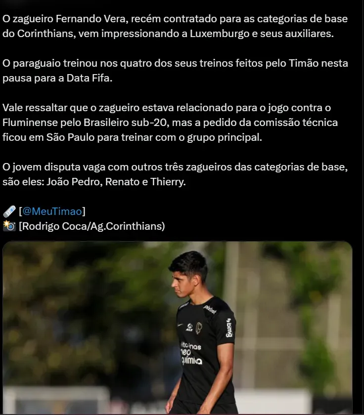 Conforme informações do portal Meu Timão, Fernando Vera está caindo nas graças do técnico da equipe paulista. O paraguaio de 18 anos foi contratado junto ao Cerro Porteño e chamou a atenção da comissão técnica do Pofexô durante a parada da Data FIFA.