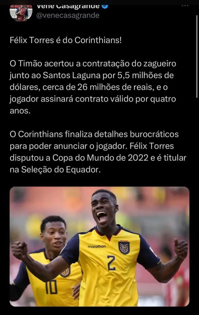 Novas informações são trazidas pelo Venê: Corinthians define últimos detalhes com Félix Torres