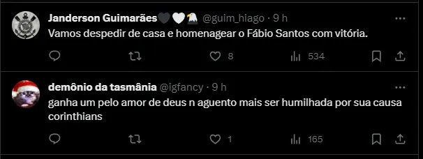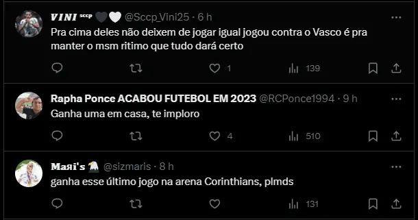 Após a partida com o Internacional, o Corinthians possui um compromisso diante do Coritiba, no Estádio Couto Pereira. A última vitória do Coxa-Branca diante do Timão ocorreu no Brasileirão de 2011, quando venceu por 1 x 0.