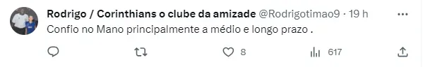 Mano Menezes ainda falou sobre como espera transformar a equipe: “A construção de alguns padrões de comportamento, a segurança de um bom posicionamento em relação aquilo que quero da equipe, e a partir dessa segurança, caminhar passos talvez não tão longos, mas certamente firmes, para cada jogo poder acrescentar uma característica a equipe, que é aquilo que eu acredito e é a característica do Corinthians nos últimos anos e que realmente o tornou vencedor”, diz.