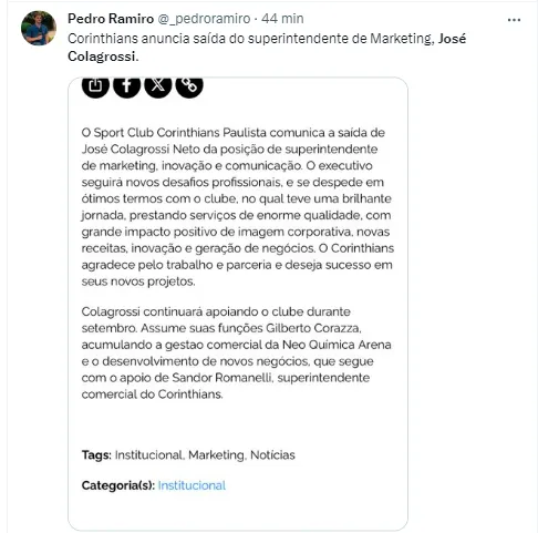 “O Sport Club Corinthians Paulista comunica a saída de José Colagrossi Neto da posição de superintendente de marketing, inovação e comunicação. O executivo seguirá novos desafios profissionais, e se despede em ótimos termos com o clube, no qual teve uma brilhante jornada, prestando serviços de enorme qualidade, com grande impacto positivo de imagem corporativa, novas receitas, inovação e geração de negócios. O Corinthians agradece pelo trabalho e parceria e deseja sucesso em seus novos projetos”, disse em seu site.