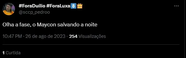 “Olha a fase, o Maycon salvando a noite”, “Se em algum momento vocês pensarem em desistir de algo, apenas lembre que o Yuri Alberto e o Giuliano são jogadores”, “Enquanto tiver Giuliano ( vulgo hipoglós) e Yuri Alberto ( vulgo bagre amarelo) não dá” e “Yuri Alberto e Giuliano é uma coisa horrorosa de se ver com a bola Parece que a bola tá castigando eles de tanto que apanham dela”, foram alguns dos comentários dos corintianos.