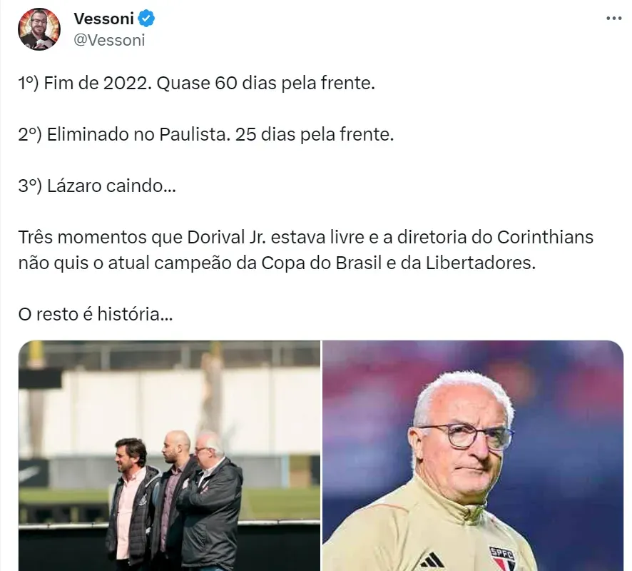 Dorival havia acabado de ganhar quase tudo pelo Flamengo e, o Corinthians, não ter procurado o treinador em dezembro não tem explicação. Dorival Júnior está entre os melhores treinadores do Brasil, com capacidade de gerir elencos com medalhões, como o do Flamengo, e com repertório tático. No Clube da Gávea, ele foi o único que conseguiu fazer Gabigol e Pedro atuarem juntos. Não há dúvidas que o Corinthians renderia muito mais sob o comando de Dorival.