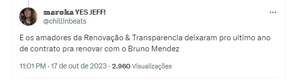 Trata-se da renovação com o zagueiro Bruno Méndez, de 24 anos. Com a já anunciada aposentadoria do lateral-esquerdo Fábio Santos, de 38 anos, a provável saída do zagueiro Gil, de 36, e ainda a possibilidade de Fágner, 34, também dar adeus, o defensor uruguaio pode ser muito importante. Caetano ainda não deslanchou e Bruno já exerce um poder forte internamente, e é um grande candidato para formar a dupla de zaga com Lucas Veríssimo em 2024.