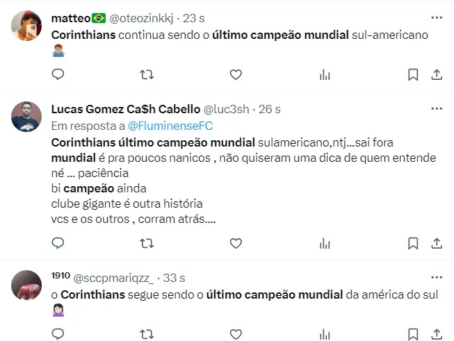 A derrota do Fluminense por 4 a 0 para o Manchester City, nesta sexta-feira (22), na final do Mundial de Clubes da Fifa, fizeram os corintianos relembrarem nas redes sociais quem foi o último time brasileiro a levantar o troféu da competição.