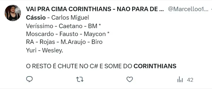 “Únicos jogadores que deviam ficar no Corinthians em 2024: Cássio, Carlos Miguel, Veríssimo, Caetano (pra reserva, mas não renovar), Moscardo, Fausto Vera, Rojas e Romero (porque o contrato acaba em 24). O RESTO É RUA!”