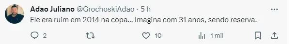 O entendimento de muitos é que a negociação pelo jogador que atuou na Copa do Mundo de 2014 não pode acontecer de jeito nenhum: “Horrível e ainda vai pedir 1 milhão, essa negociação não pode acontecer nunca”, acrescentou outro internauta.