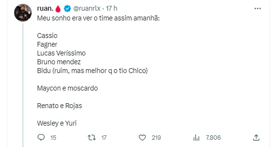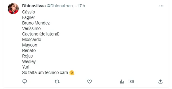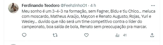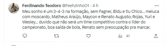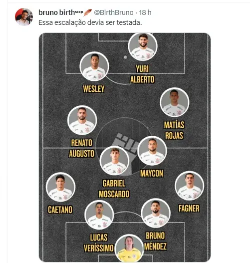 Para conseguir reagir no Brasileirão, alguns torcedores se manifestaram e revelaram qual seria a escalação do Timão para o jogo. Um jogador que não é titular absoluto foi unânime: o jovem Wesley, de apenas 17 anos. Na opinião da Fiel, passou da hora da promessa ser titular da equipe. Além dele, muitos disseram que Caetano deve ser usado na lateral-esquerda, ficando à frente dos dois jogadores da posição, Fábio Santos e Matheus Bidu.