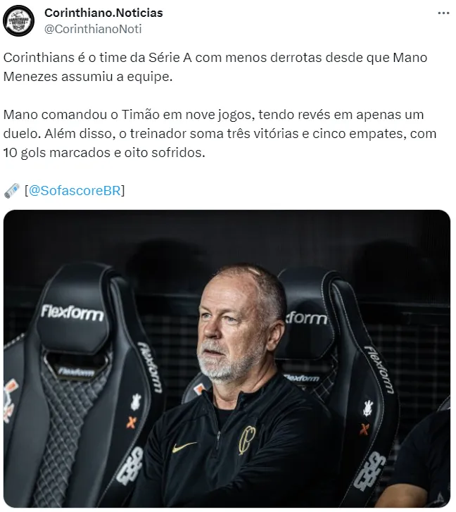 Com Mano no comando, o Corinthians é o time que menos perdeu no Brasileirão. São três vitórias, cinco empates e apenas uma derrota em nove jogos com o treinador no Timão.