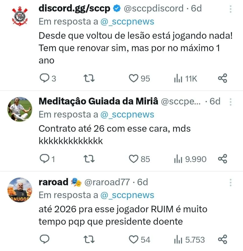 “Tem que emprestar/vender esse bagre em 2024”, escreveu um torcedor. “@amelo12oficial some com esse lixo do Corinthians”, comentou outro seguindo o mesmo pensamento de que o atacante deve deixar a equipe.