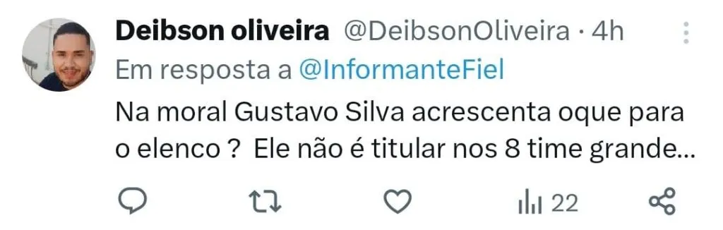 “É sério q pensam em renovar o contrato do Gustavo Silva? Pra quê? Já era ruim antes da lesão, voltou 10 vezes pior”, questionou um internauta antes mesmo da confirmação da nova lesão do atacante.