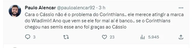 No entanto, outra ala dos torcedores discordaram veementemente. Houve os que defenderam que Cássio foi um dos poucos que se destacou em 2023: “Não entendo essa tara de aposentar o Cássio, pra mim é o único que tem que ficar”, disse um usuário da rede social. Outro se mostrou a favor do goleiro alcançar Wladimir como o jogador que mais atuou pelo Timão: “Merece atingir a marca do Wladimir! (…) Se o Corinthians chegou nas semis esse ano foi graças ao Cássio”, finalizou.