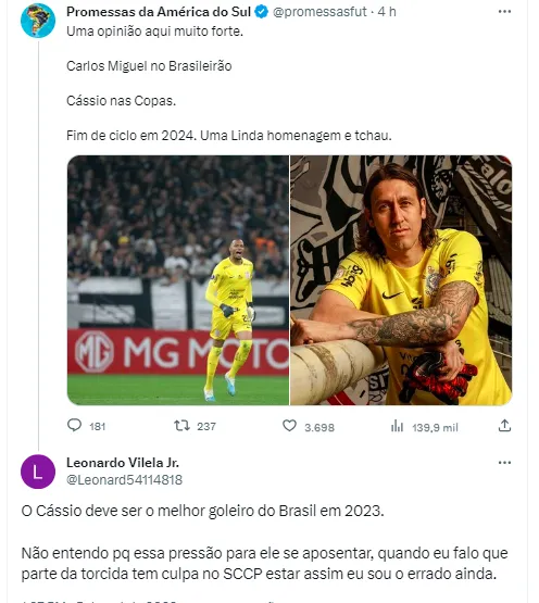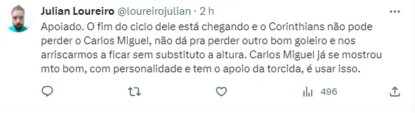 Pelo Twitter, um torcedor disse que Cássio tem que ser usado apenas em Copas, caso o Timão dispute alguma e que o próximo ano tem que ser o último ano do goleiro: “Carlos Miguel no Brasileirão, Cássio nas Copas. Fim de ciclo em 2024. Uma linda homenagem e tchau”, disse um torcedor. Outro foi na mesma linha: “Deixa o Carlos já ser titular ano que vem”, completou. Por fim, outro internauta se mostrou favorável à mudança: “Tem que saber fazer essa transição”, completou.