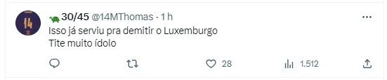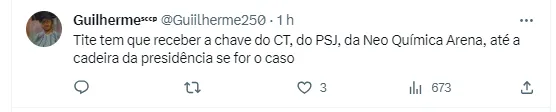 Isso foi mais que suficiente para muitos torcedores passarem a se iludir e acreditar que o ex-treinador da Seleção Brasileira vai voltar para o Timão. Alguns, inclusive, disseram que a demissão de Luxa se deu por conta de uma eventual chegada de Tite: “Tá na cara que o Corinthians demitiu o Luxemburgo para contratar o Tite antes do Flamengo”, afirmou um torcedor, deixando claro o que pensa da estratégia de Duílio.