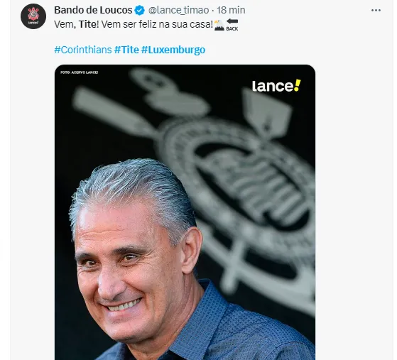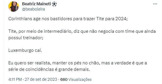 Outro torcedor opinou que o Clube Paulista percebeu que Tite só aceitaria conversar caso não houvesse treinador no comando da equipe: “Tite já deu o papo que só negociaria se o treinador não estivesse no trabalho, Corinthians deu uma de João sem Braço e mandou Luxa embora, com chances reais de pegar o Tite”, revelou outro torcedor. Outra internauta foi na mesma linha: “Eu quero ser realista, manter os pés no chão, mas a verdade é que a série de coincidências é grande demais”, completou.