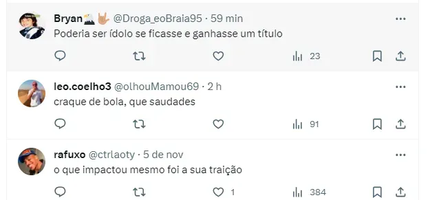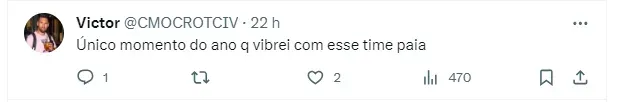“Único momento do ano que vibrei com esse time ‘paia’”, disse um torcedor no Twitter. Outro foi pela mesma linha: “Tema da redação: como este gol do jogador Róger Guedes impactou nos dias de hoje”, completou.