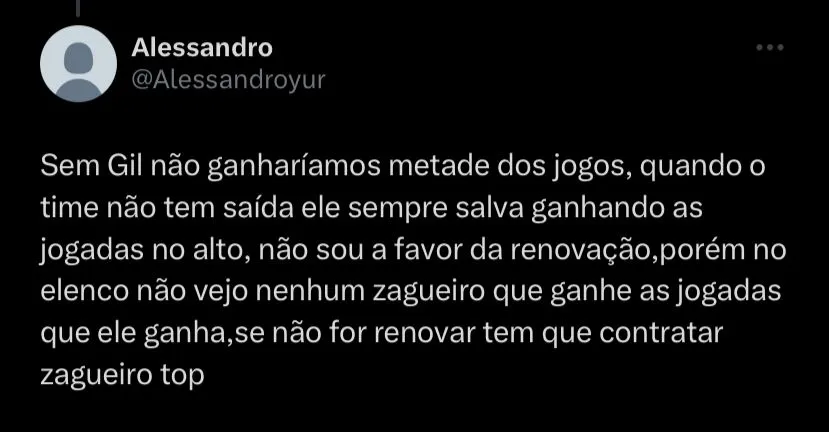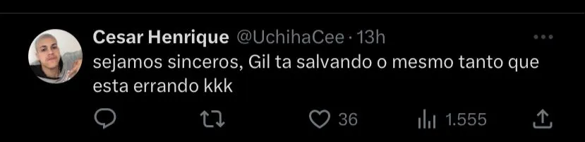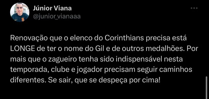 “Sejamos sinceros, Gil ta salvando o mesmo tanto que esta errando kkk” , “Sou crítico pra ca* do futebol do Gil esse ano, mas o que ele vem salvando a gente com essas bolas aéreas é brincadeira kkk” , “Gil sempre salvou, de longe nunca foi um dos problemas. A diretoria e a lateral-esquerda é o problema” , “Ele participou de 10 pontos para o Corinthians e uns 10 para os adversários” , “Falar em ‘regularidade’ em relação ao Gil não é o melhor termo. Oscila muito na defesa e agora tá compensando no ataque” , escreveram alguns torcedores do Corinthians no Twitter.