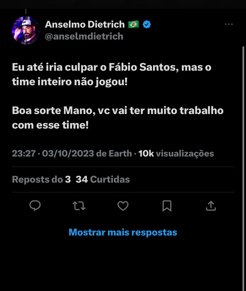 A culpa sobrou até mesmo pro recém-chegado Mano Menezes: (SIC) “Eu avisei, que se contratasse o Mano Menezes, era pedir pra jogar a série B. Obviamente, as críticas sobraram também para o presidente: “Acordei e Duilio segue presidente do Corinthians Bom dia pra quem?”; disse outro torcedor; “A gente merecia muito uma final. Um título. Mas Duílio Monteiro Alves e esse time mereciam esse vexame. O duro é que quem sente somos nós”, disse o outro. Agora, o Corinthians volta a campo somente contra o Flamengo, no sábado (7). às 21h, na Arena.
