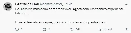 “Dá mais não. Toda hora panturrilha dói, joelho incha, coxa estira. Tem que cortar essa “Renato dependência” pela raiz. Ou o time vai sem ele, ou racha logo. E tem como sim, é só contratar com inteligência”