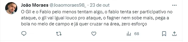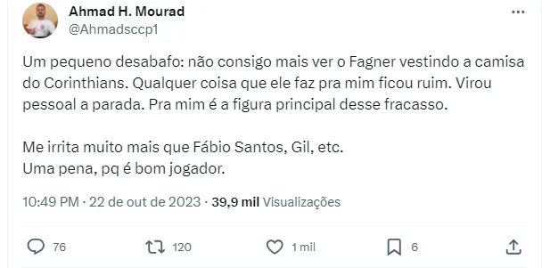 Pelo Twitter, houve quem disse que não aguenta mais vê-lo em campo: “Um pequeno desabafo: “Não consigo mais ver o Fagner vestindo a camisa do Corinthians. Qualquer coisa que ele faz pra mim ficou ruim. Virou pessoal a parada. Pra mim é a figura principal desse fracasso. Me irrita muito mais que Fábio Santos, Gil etc”, desabafou. Outra, disse que o camisa 23 só tem enganado: “O Fagner está há umas três temporadas só enganando e completamente fora de forma. E ainda se acha o dono do Clube. Só aparece pra dar entrevista na boa fase”, disse.