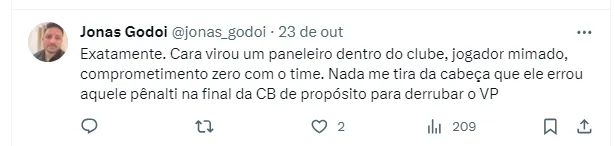 Houve ainda quem afirmou que Fagner errou o pênalti da final da Copa do Brasil contra o Flamengo, no ano passado, de propósito: “Virou um paneleiro dentro do clube, jogador mimado, comprometimento zero com o time. Nada me tira da cabeça que ele errou aquele pênalti na final da Copa do Brasil de propósito para derrubar o VP”, afirmou. Outro internauta foi na mesma linha: “Pra mim, é a cara desse Corinthians, sem compromisso, nem aí pra torcida”, completou