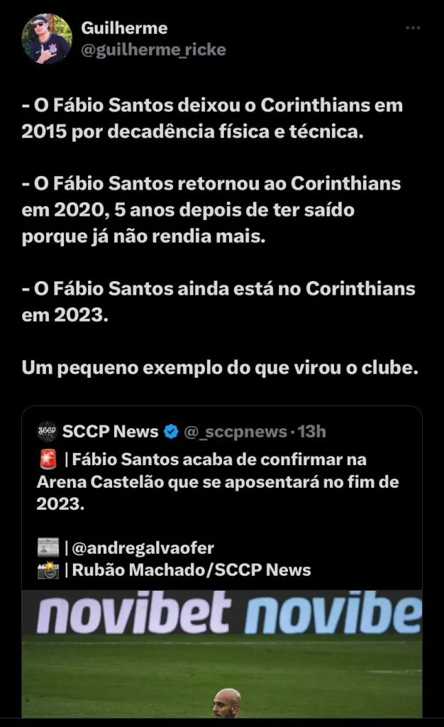 Apesar de toda a idolatria no Corinthians, a Fiel vê de bom tom a aposentadoria do jogador no final do ano: (SIC) “Fábio Santos e Lucas Piton não fizeram muita coisa de diferente em 2022. Ambos foram regulares. Mas só que um tinha 37 anos e o outro tinha 23. E nós sabemos que a maturação de um lateral demora”; “Sou sempre favorável a culpar a diretoria antes de qualquer coisa. São os maiores culpados por Fábio Santos ser titular do Corinthians ainda? Sim. Mas daí pra ele não ter culpa é um pulo muito grande… falhou em sete gols em duas semanas. Tem muita culpa também”, foram algumas opiniões da Fiel.