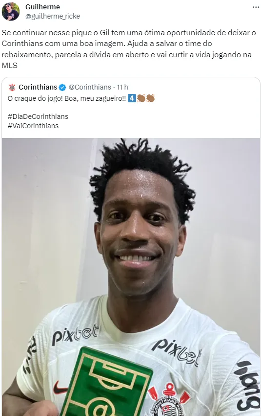 Aos 36 anos e com contrato até o final de 2023, Gil não deve ser procurado para renovar com o Clube. Apesar disso, o zagueiro não esconde o orgulho de ser Alvinegro. “É importante estar em um clube como o Corinthians, é bom estar aqui. Estava até conversando com o Cássio hoje, como é gostoso estar no clube, a gente continua trabalhando pelo melhor do Corinthians”, concluiu.