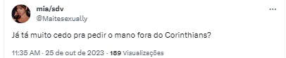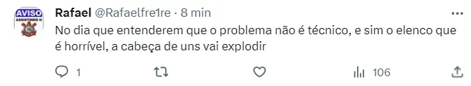 E como isso pode influenciar em mais uma partida longe da Neo Química Arena? A verdade é que, por exemplo, nem em casa o time conseguiu vencer o lanterna América-MG, na última rodada, e apenas empatou em 1 a 1, sendo que saiu atrás do placar. Um momento ruim, que em reta final de temporada, pode colocar ainda mais riscos e agora, o objetivo da equipe é se afastar da parte incômoda da tabela.