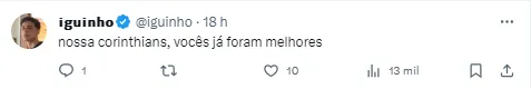 “Temos que ambicionar mais, não podemos nos acomodar com isso, achar que está bom. Não podemos pecar com isso. Já fizemos com muitas mais oportunidades e não vencemos”, cobrou o técnico do Timão.
