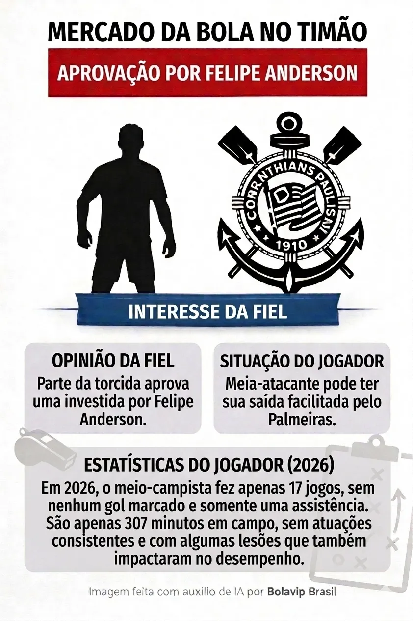 Vale lembrar que Felipe Anderson, em 2026, fez apenas 17 jogos, sem nenhum gol marcado e somente uma assistência. São apenas 307 minutos em campo, sem atuações consistentes e com algumas lesões que também impactaram no desempenho.
