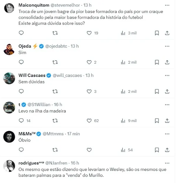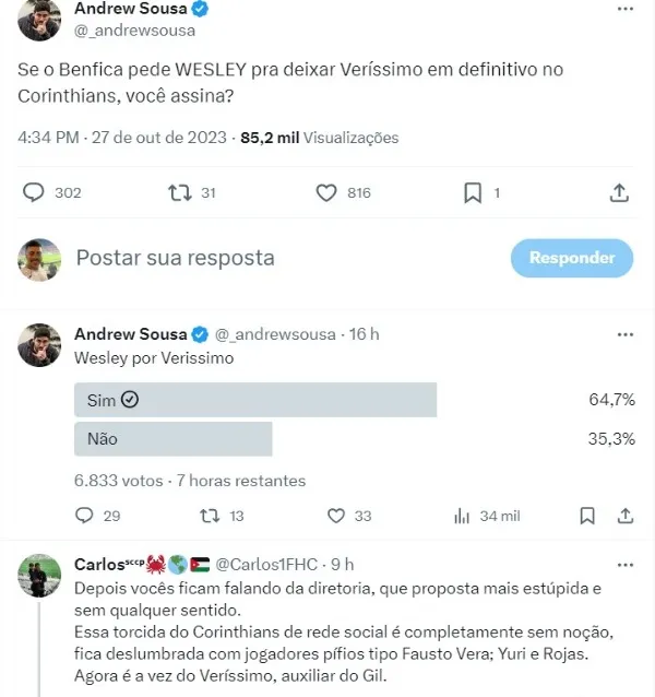 “Se o Benfica pede WESLEY pra deixar Veríssimo em definitivo no Corinthians, você assina?”, perguntou nas suas redes sociais.