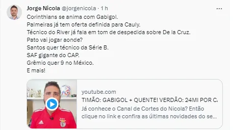 Nicola ainda completou que entrou em contato um dirigente do Timão e recebeu a seguinte resposta sobre a situação. “Se o Gabigol quiser jogar no Corinthians em 2024, escreve aí, ele vai jogar aqui”.