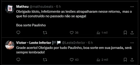 Paulinho, em entrevista à TV Corinthians, deixou um recado para a Fiel torcida e também ao clube: “É a gratidão. O Corinthians me proporcionou quatro títulos importantes na minha vida, principalmente a Libertadores. Eu falo que sou privilegiado por ganhar um título como esse, que era tão sonhado pelo torcedor corintiano“.