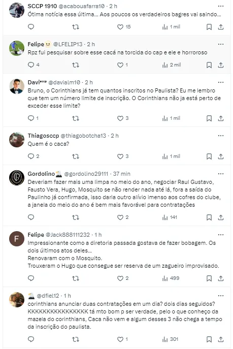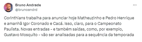 “Corinthians trabalha para anunciar hoje Matheuzinho e Pedro Henrique e amanhã Igor Coronado e Cacá. Isso, claro, para o Campeonato Paulista”, iniciou o colega Bruno Andrade.
