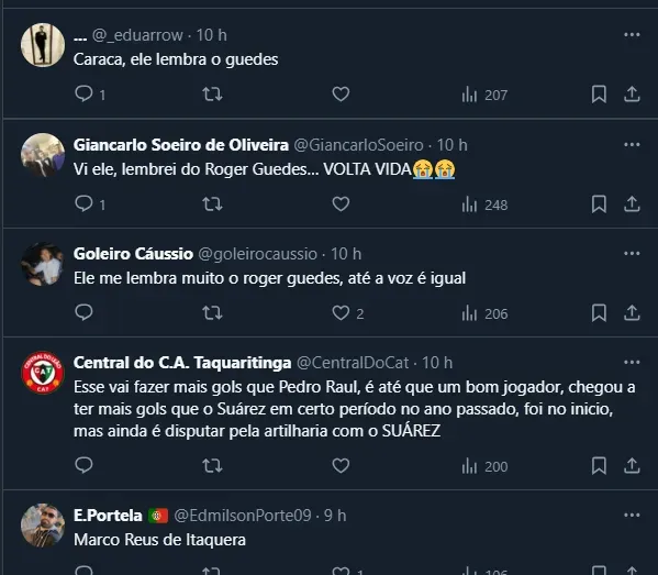 Durante as 90 partidas que disputou pelo Inter, foram 21 gols e sete assistências. No entanto, um fato que chocou muitos torcedores após a primeira entrevista foi a semelhança com Róger Guedes, atacante que deixou o Alvinegro em alta e traz boas lembranças.