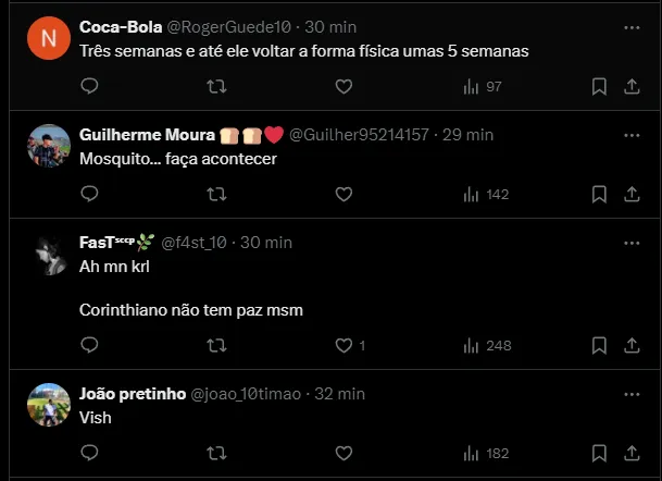 Portanto, caso permaneça fora durante esse período, o jogador do Corinthians não fica à disposição nos jogos com América-RN, pela Copa do Brasil, além de não atuar mais na fase de grupos da Copa Sul-Americana, segundo a ‘Gazeta Esportiva’.