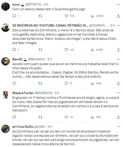 O Corinthians recebeu o América-MG na Neo Química Arena e não conseguiu os três pontos fundamentais para se distanciar do Z-4 do Brasileirão. O empate de 1 a 1 no último domingo (22) complicou a situação do Timão na tabela, que agora está a três pontos da zona da degola, que tem o Vasco na 17ª posição, com 30 pontos. A preocupação no Parque São Jorge aumentou e assim como a Fiel Torcida, ex-jogadores e ídolos do Alvinegro protestam contra a inoperância Alvinegra na tabela.