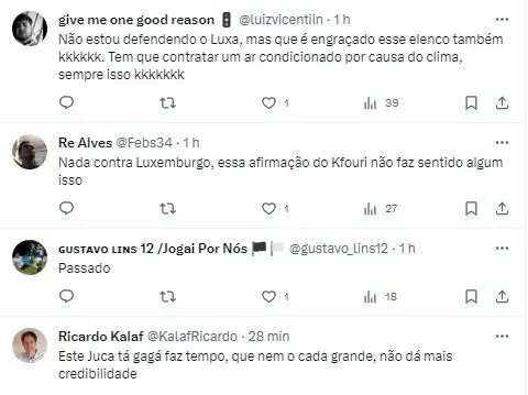 “O Luxemburgo é brincadeira. Tal ponto que o Cruzeiro usou o Luxemburgo despiste. Olha que ponto nós chegamos. Vocês sabem até melhor do que eu de detalhes de como foi a saída dele, das coisas que ele dizia para jogador. Que não queria ver coxa de homem, suspende o short, dizia isso para o Fábio Santos”, revelou.