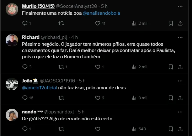 “Péssimo negócio. O jogador tem números pífios, erra quase todos os cruzamentos que faz. Daí é melhor deixar para contratar após o Paulista, pois o que ele faz o Romero também“, disse um torcedor que não aprova o nome.