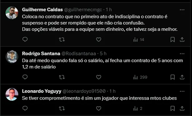 Outros comentários também chamam a atenção: “Coloca no contrato que no primeiro ato de indisciplina o contrato é suspenso e pode ser rompido que ele não cria confusão“, mostrando que a torcida não terá paciência.