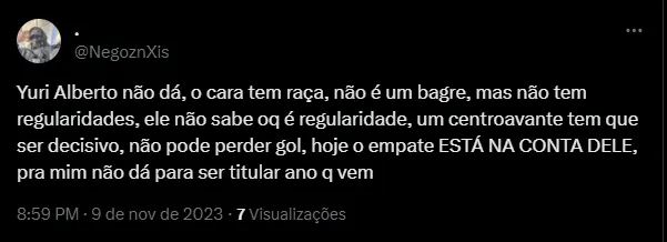 “Cada gol que o Yuri Alberto perde eu perco 10 anos de vida”, “Quatro vezes saiu na cara do gol e nem fez cócegas ao goleiro adversário” e “Hoje o empate ESTÁ NA CONTA DELE, pra mim não dá para ser titular ano que vem”, foram alguns dos comentários.