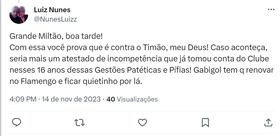Porém, ele também falou mais sério e disse que Gabigol já provou no Flamengo saber como se tornar ídolo de uma grande torcida e, portanto, poderia repetir o mesmo sucesso com a camisa do Timão.