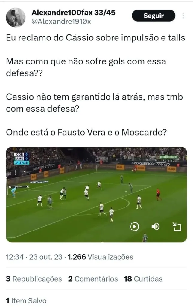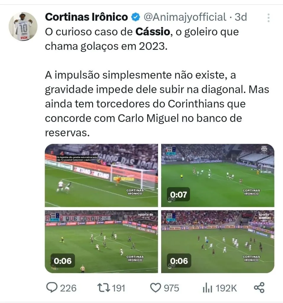 Milly Lacombe destacou que Cássio não consegue ter tanto impulso como antes. “Cássio já não tem a impulsão de antes. Em bolas à meia altura e rasteiras ele faz mágica, mas o número de golaços que ele tem levado em bolas altas deveria chamar a atenção para a atual dificuldade em saltar”, destacou.