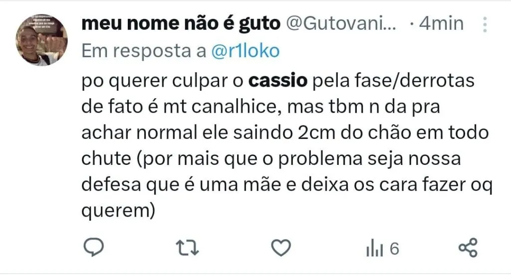 Um dos nomes destacados pela colunista foi o do goleiro Cássio que segundo ela merece ser reconhecido pelos seus feitos no Corinthians, mas deve deixar a equipe. “Cassio Ramos é o maior goleiro da história de um clube que já teve monumentos debaixo da trave. Merece estátua, documentário, biografia, sala exclusiva no museu do Corinthians. Uma década de Cássio no gol. Uma década de glórias. Isso dito, com tristeza mas também com firmeza, seria preciso compreender que Cássio deve sair. Ao lado de outros ídolos a quem a torcida só tem a agradecer”, afirmou a jornalista, em sua coluna no Uol.