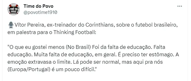 Falando em comandantes que já dirigiram o Time do Povo, uma situação acabou repercutindo neste sábado (9) envolvendo um ex-técnico da equipe. Trata-se do português Vítor Pereira, que comandou o Timão em boa parte de 2022. O profissional que também dirigiu o Flamengo, neste ano, fez duras críticas à educação dos torcedores do futebol brasileiro.