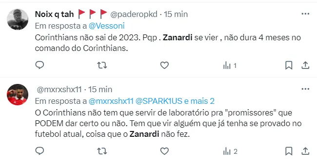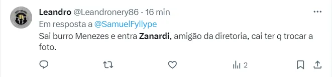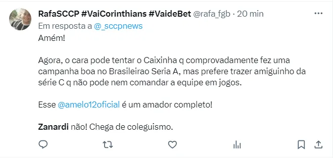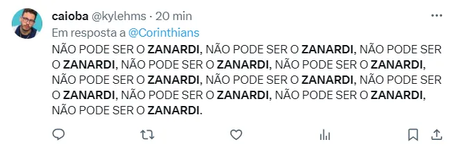 “NÃO PODE SER O ZANARDI, NÃO PODE SER O ZANARDI”, repetia diversas vezes a publicação. Outro corintiano deu mais opções a Augusto Melo, sugerindo técnicos que já estão empregados.
