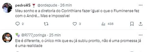 Mano também apelou para a Fiel Torcida: “Eu torço para que, mesmo que tenha negociação, fique mais tempo com a gente, porque certamente vai alegrar muito o torcedor do Corinthians”. Augusto Melo agendou uma reunião com Mano Menezes para os próximos dias e o treinador do Timão comentou o fato:
